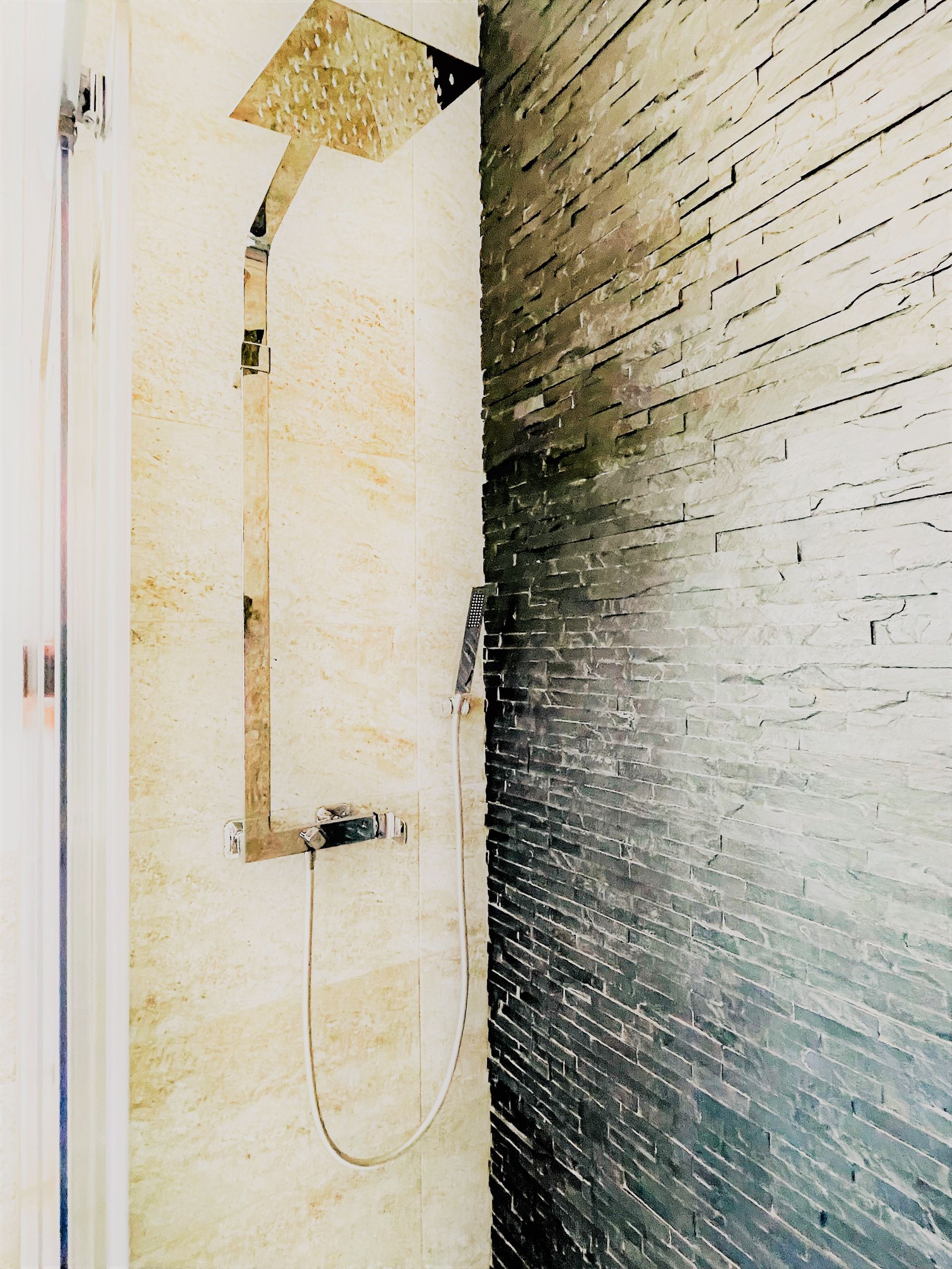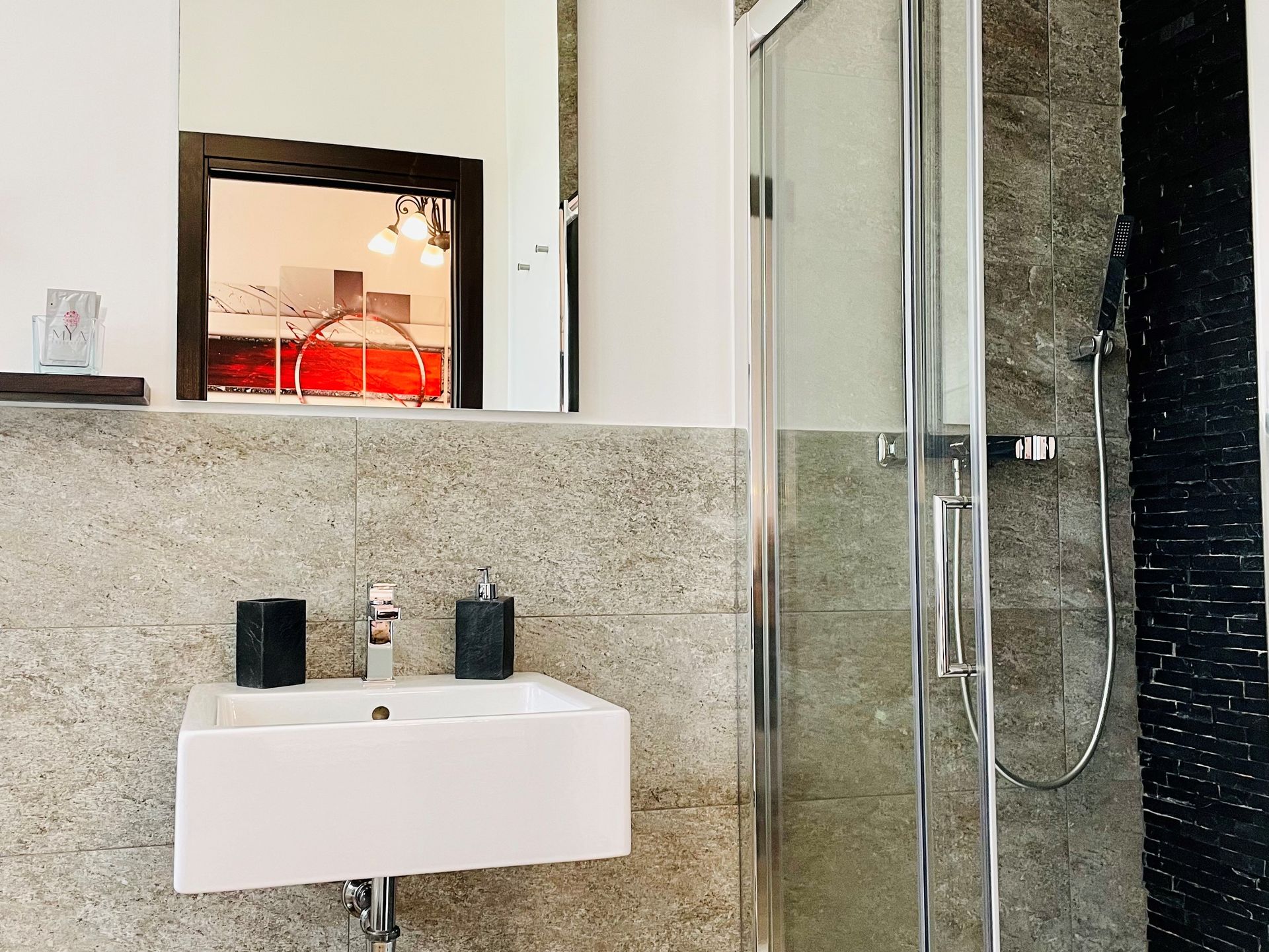 chambre spacieuse et confortable avec salle de bain privée meublée dans un style moderne et essentiel inspiré de l'ardoise, une pierre naturelle noirâtre au plomb avec une touche de couleur.